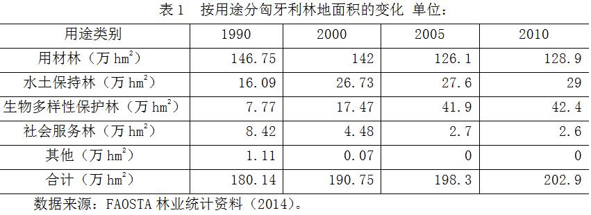 按用途划分,2010年匈牙利用材林占森林总面积的64%,水土保持林占21%,生物多样性保护林占14%,社会服务林占1%。具体见表1。